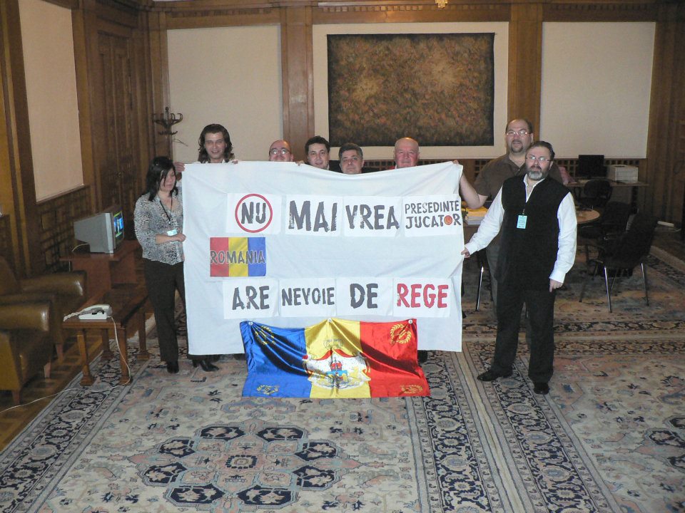 Bogdan Calehari: „Poate am mai fi monarhisti si acum, unii dintre noi, dar am ramas pe afara in “ploaie” si ” zloata” ( pe unde eram obisnuiti sa stam si prin 90,91,92), si ne uitam pe fereastra, inauntru, unde-i cald si bine. Acolo, Majestatea Sa, sta la masa cu Dan Voiculescu, Ion Iliescu( si altii de rangul lor, sau “gradul” lor ?) si se imbratiseaza cu Putin. Nu vrem sa deranjam. Eu unul sunt multumit ! Acu’, ca s-a dat voie, toata “lumea buna” e monarhista. La mine la serviciu, aia care acum 22 de ani vroiau sa ma dea afara( Fir-ar al dracu’ de golan cu taranistii si cu balbaitu’ tau cu tot !) acu, sunt toti cu regele si, bineinteles, tot cu domnu’ iliescu si, mai nou , cu domnu’ Voiculescu.”
