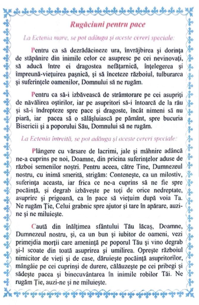Sfântul Sinod al Bisericii Ortodoxe Române a cerut tuturor preoților să rostească, la Liturghia din 24 august, rugăciunile speciale pentru pace recomandate de Părintele Patriarh Daniel deja din luna martie, 2022. Este un gest firesc și nobil, care arată grija Bisericii noastre față de problemele stringente ale lumii de astăzi.