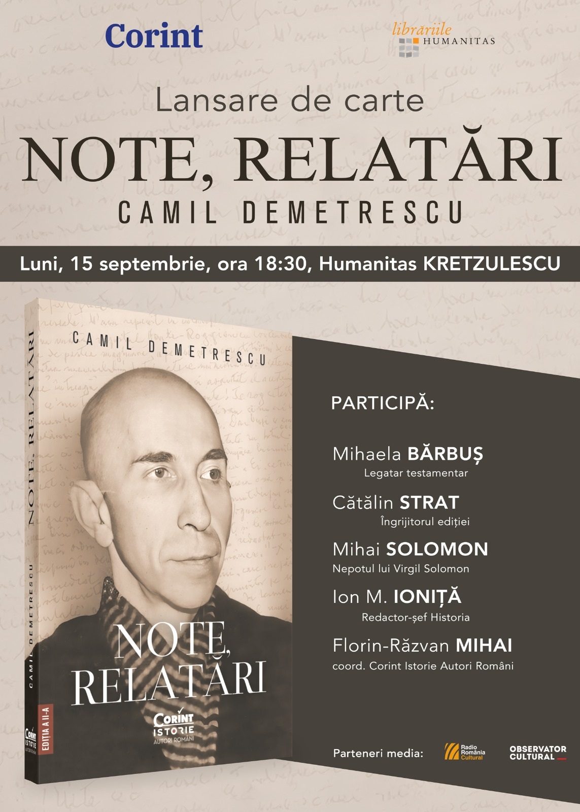 Vă invităm luni, 15 septembrie, la ora 18:30, la lansarea cărții de memorii a lui Camil Demetrescu - "Note, relatări". Lansarea va avea loc la librăria Humanitas Kretzulescu, București. Printre participanți și vorbitori se numără Mihala Bărbuș (legatar testamentar), Cătălin Strat (îngrijitorul ediției), Mihai Solomon (Nepotul lui Virgil Solomon), Ion M. Ioniță (redactor-șef Historia), Florin …